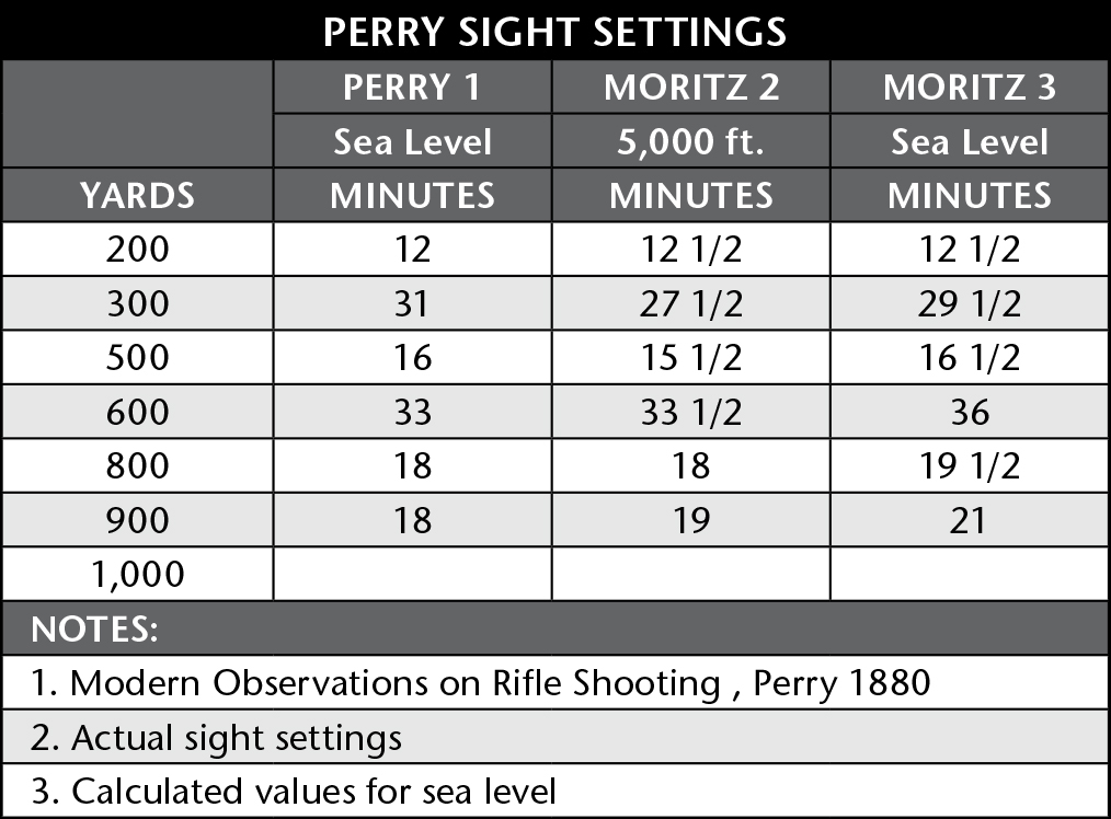 How would these velocities compare with historical information? Within Perry’s book Modern Observations on Rifle Shooting, sight settings are presented for the Sharps long-range rifle, Model 1878.2 No estimated velocities are presented. I was curious to see how my actual sight settings might compare to those presented in Perry. Black powder charges used by 34 competitors at the September, 1879, Long-Range Tournament at Creedmoor were from 93 to 115 grains.2 Bullet weights were listed as 550 grains except for one shooter using a 530-grain bullet.