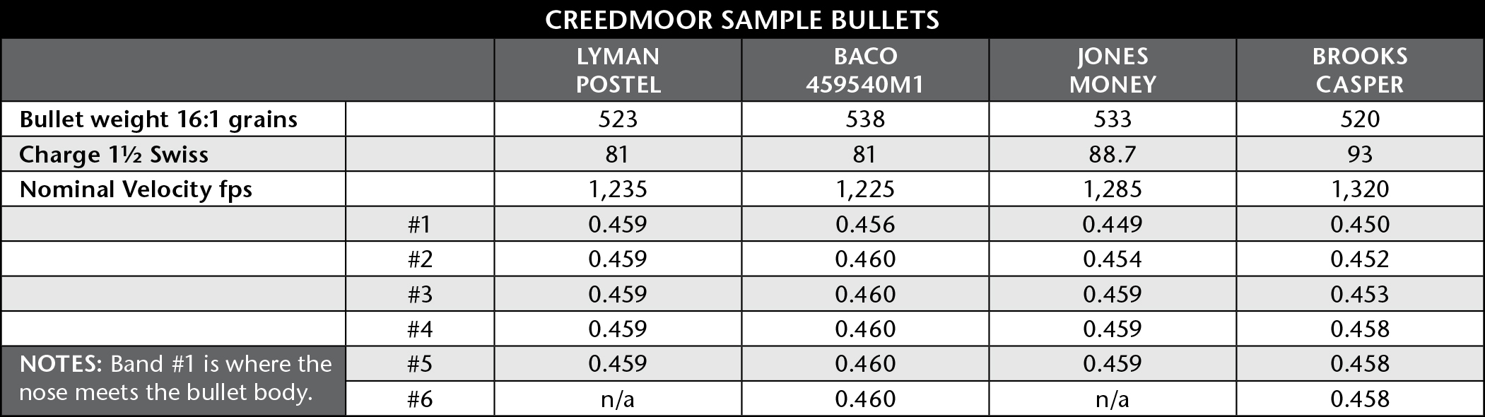 A bullet with a nose very near the bore diameter is necessary for proper bullet alignment as mitigation against tipping. You will note within the Creedmoor Sample Bullets Chart that all bullets shown the No. 1 band (on the nose) are within 0.001 inches of 0.450 inch or greater than 0.450 inches.