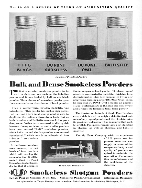 We ran across this ad by the DuPont Company in the December 1930, issue of the American Rifleman magazine. In reading old match reports from the late 1800s, one will often notice the listing of “Bulk Shot Gun” powder as an ingredient in old duplex Schuetzen rifle loads. Harry Pope, most notably, was very fond of this powder when using his duplex powder measure. Naturally, we were interested upon seeing this ad in the direct comparison between black powder, DuPont bulk smokeless, DuPont Oval and Balliste powders. Needless to say – a picture is worth a thousand words.