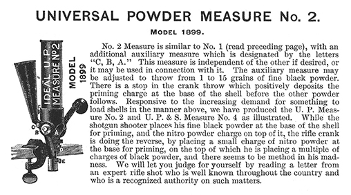 The Ideal Universal Measure, either No. 2 or No. 4, does the work with neatness and dispatch. Having two adjustments, one for the smokeless and one for the black, they are easily and quickly changed to suit any cartridge on the market.