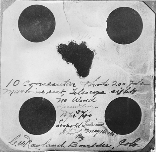 “The load used in making this target was 3 grains No. 1 Dupont smokeless, 7 ½ U.M.C. primer, and the shell filled nearly full with hazard Fg powder, making a bulk charge of about 46 grains. Before using the powder it was very carefully sifted through several sieves to be perfectly sure that it was of even grain. The bullets were (cast) 1-10, lubricated with Leopold’s No. 6 lubricant. Oleo grease wads were employed. The rest was a Stevens-Pope No. 1 rear and No. 2 front, supported on a very heavy wooden frame, deeply seated in the earth, and strongly braced.”